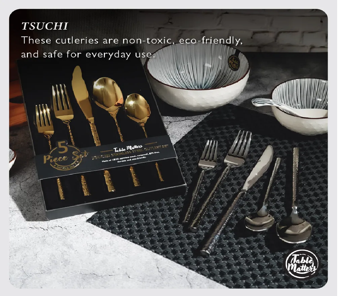 Discover the myriad benefits of introducing the Tsuchi Cutlery Set to your table. Experience the amalgamation of safety, health, and exquisite design as each piece is thoughtfully liberated from lead and cadmium. The brilliant gold finish doesn't just cater to the aesthetics but serves easy, effortless maintenance, blessing your after-meal times with a hassle-free, dishwasher-safe cleanup.